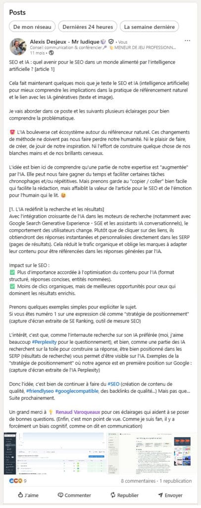 Exemple ci-contre d’un article linkedin qui explicite le sujet du seo et de l’IA avec dans les commentaires un lien vers la page de notre site qui y fait référence. Pour générer un traffic organique des réseaux sociaux vers le site.